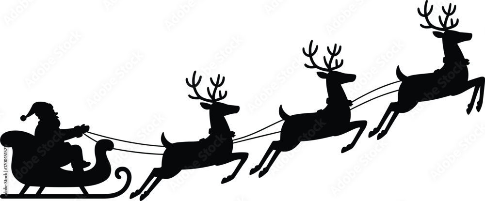 Obraz na plátně Santa Claus riding sleigh with reindeer, flying Christmas silhouette illustratio
