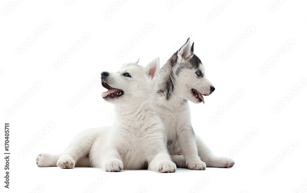 Obraz na plátně Front view of two pretty puppies of siberian husky dog, girl and boy, white and gray with blue eyes, resting at studio and playing