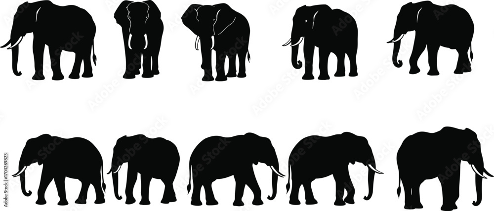 Obraz na plátně Silhouette set of elephants in various poses, wildlife animal collection, black
