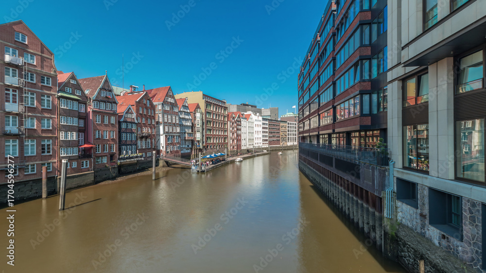 Obraz na plátně Panorama showing Kleines Dock along the northern Elbe Canal aerial timelapse in Hamburg, Germany