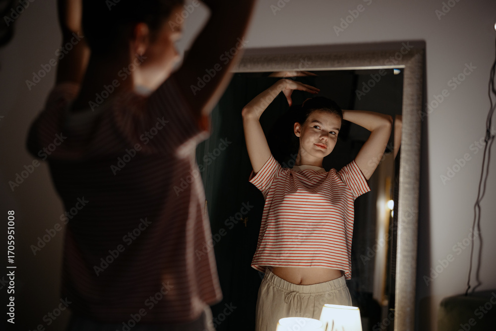 Obraz na plátně A young woman stands in front of a mirror, arms raised, as she admires her reflection in a softly lit room