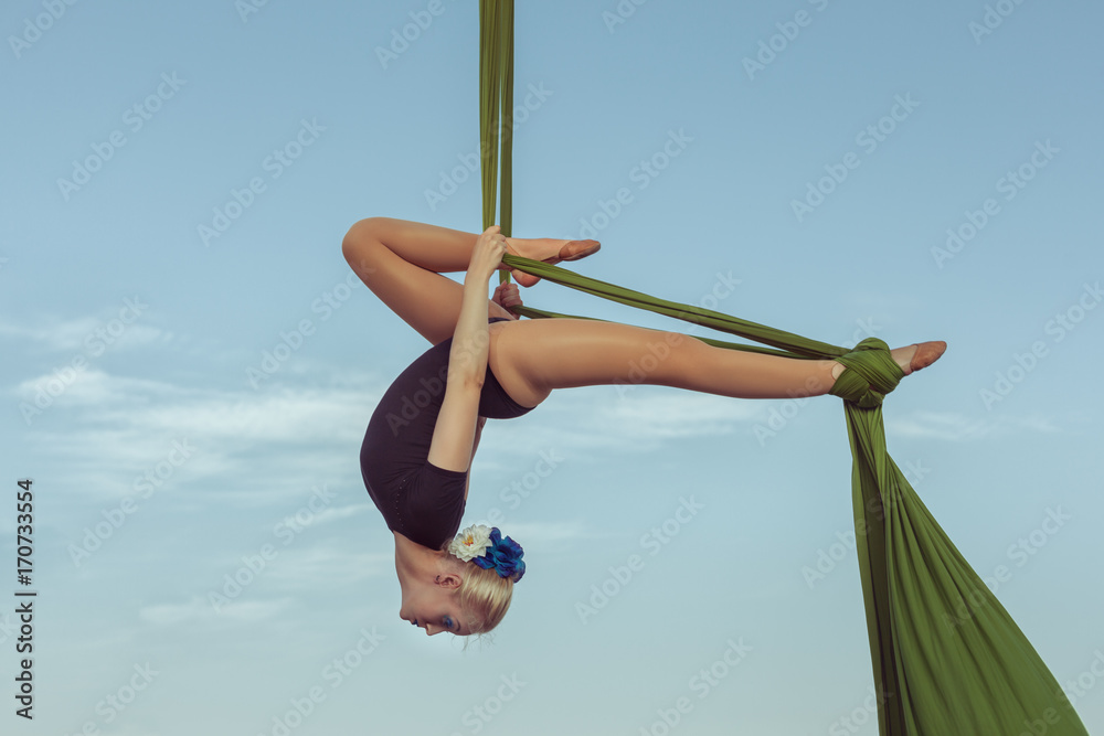 Obraz na plátně Woman air gymnast performs a trick on a hammock high in the sky.