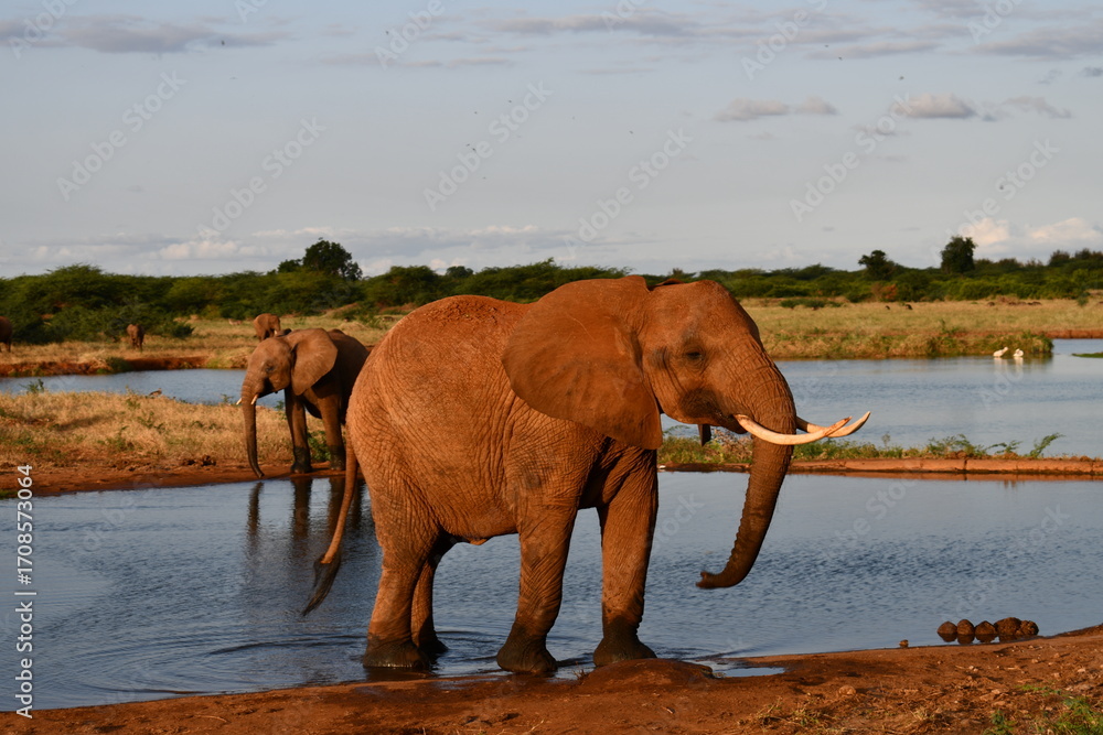 Obraz na plátně Majestic elephants drinking water at sunset in Africa