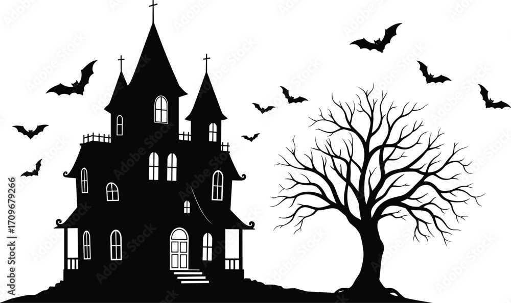 Obraz na plátně Spooky haunted house silhouette with eerie bare tree and flying bats Halloween v