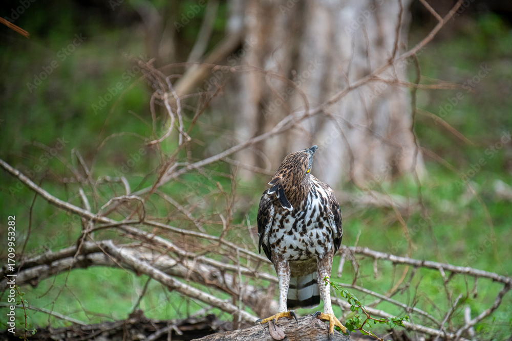 Obraz na plátně A regal Changeable Hawk-Eagle perches majestically on a tree branch, its striking crest and keen eyes observing the vibrant, green forest surroundings of Sri Lanka