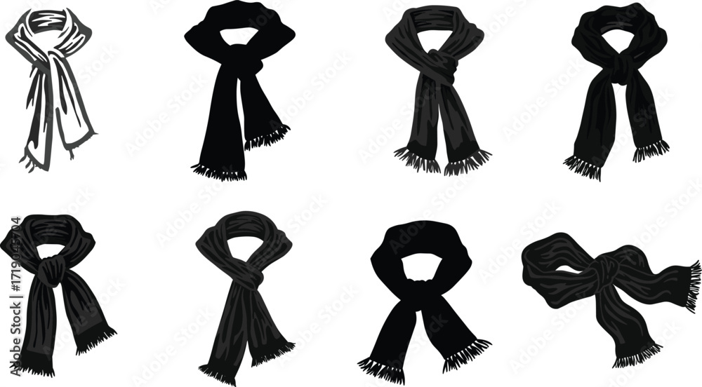 Obraz na plátně Scarf icon set, assorted tying styles and drape designs, black silhouette winter