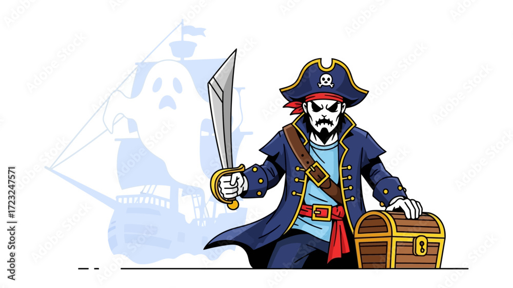 Obraz na plátně Pirate and Ghost Ship: A fierce pirate, ready for adventure with a gleaming cutlass, stands guard over his treasure