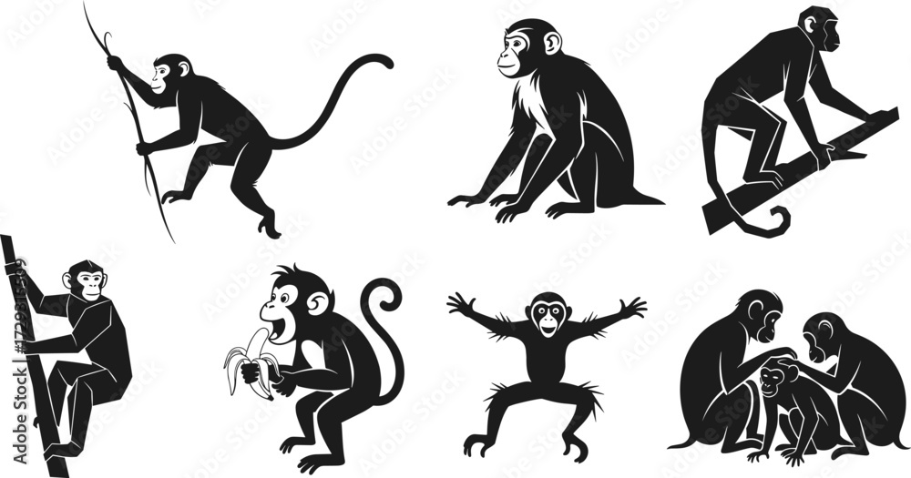 Obraz na plátně Monkey silhouette vector set with monkeys climbing eating bananas sitting groomi