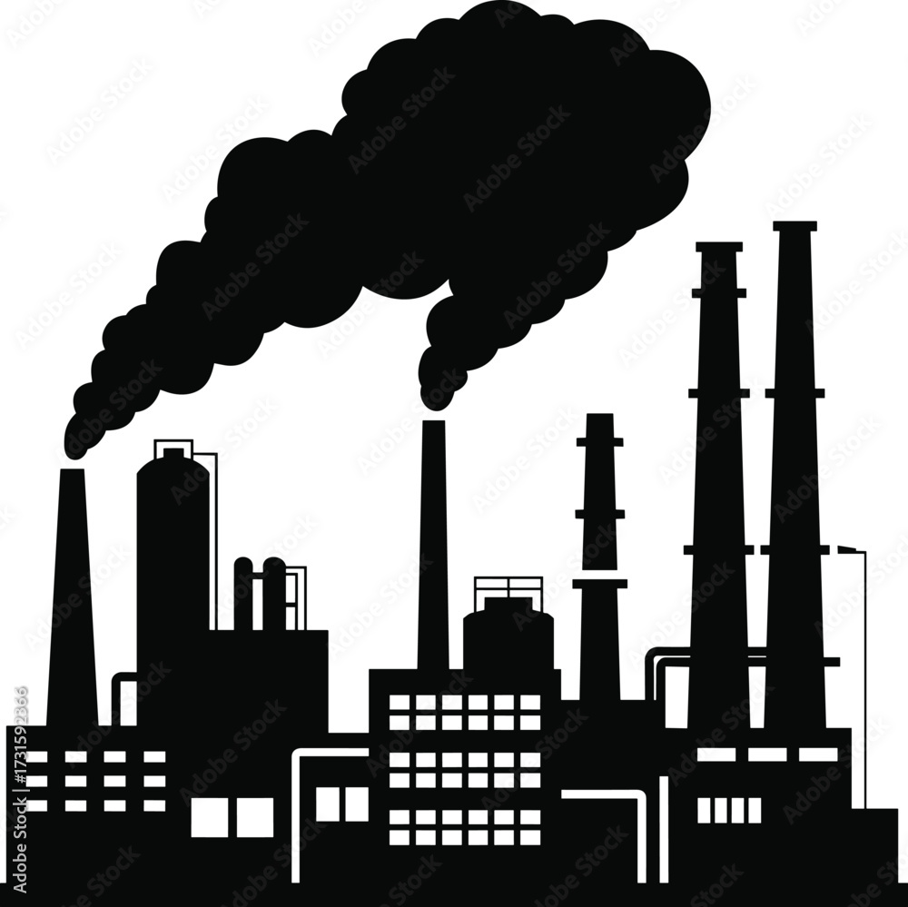 Obraz na plátně Black silhouette of industrial factory with smoke billowing from chimneys indust