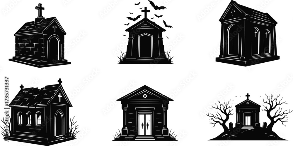 Obraz na plátně Dark cemetery mausoleum vector illustration with gothic chapel, haunted crypts, spooky graveyard tombs, bats, eerie trees, and Halloween horror elements