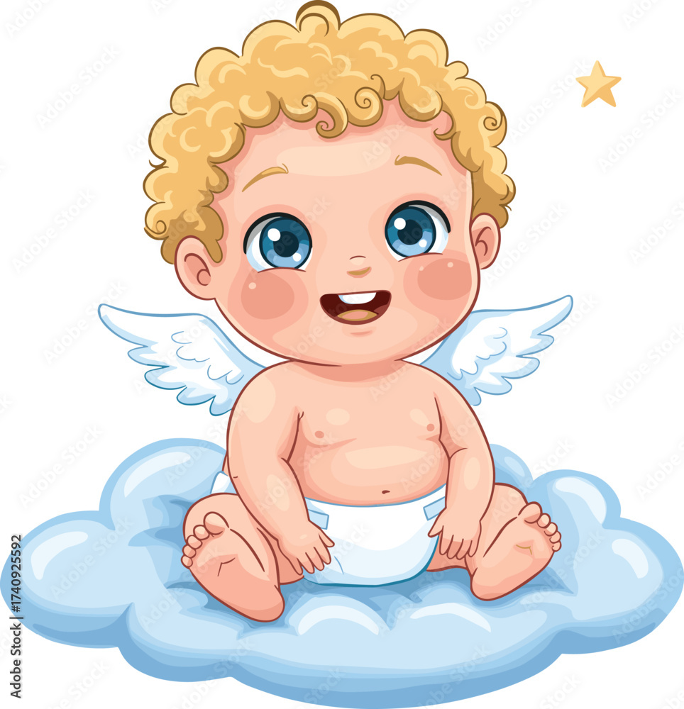 Obraz na plátně Cute baby angel with golden curly hair, white wings, sitting on fluffy blue clou