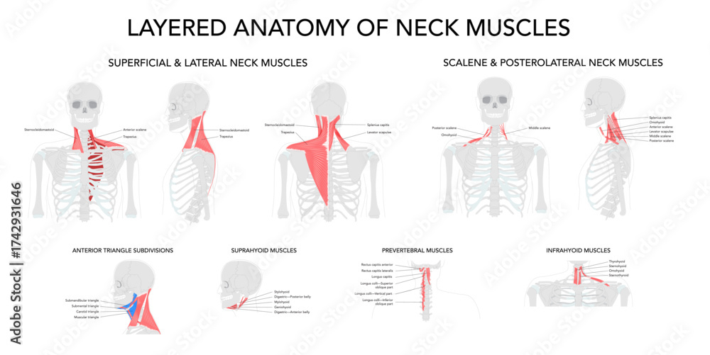 Obraz na plátně Set of Layered Anatomy of Neck Muscles - Detailed anatomical illustration showing the neck muscles organized in layers from superficial to deep, including cervical and prevertebral muscles