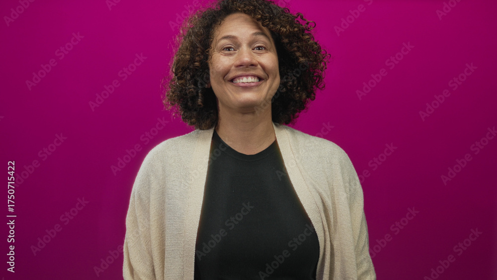 Obraz na plátně Woman smiles widely and frames her face with both hands against a vibrant pink studio wall; joy playfulness warmth