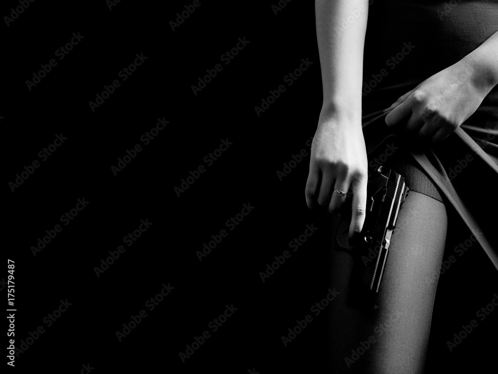 Obraz na plátně female show stockings under skirt with gun on black background with copy space