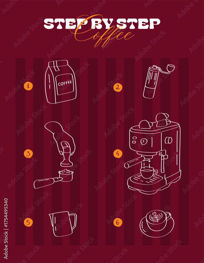 Obraz na plátně Complete espresso brew walkthrough stepwise visual recipe in doodle style for ho