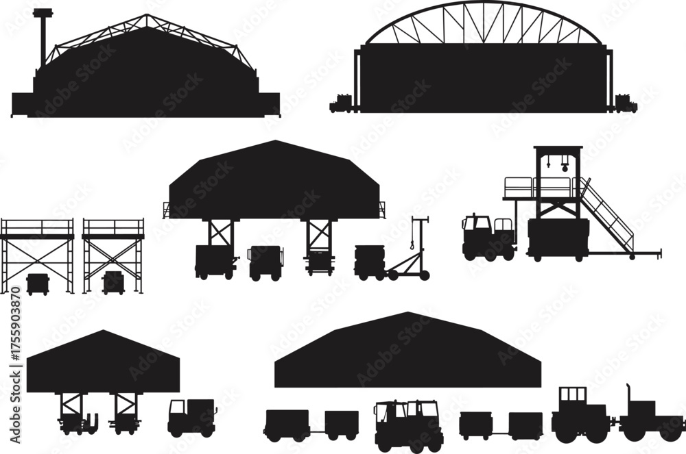 Obraz na plátně Industrial warehouse and logistics icons set with trucks, cargo, loading docks,