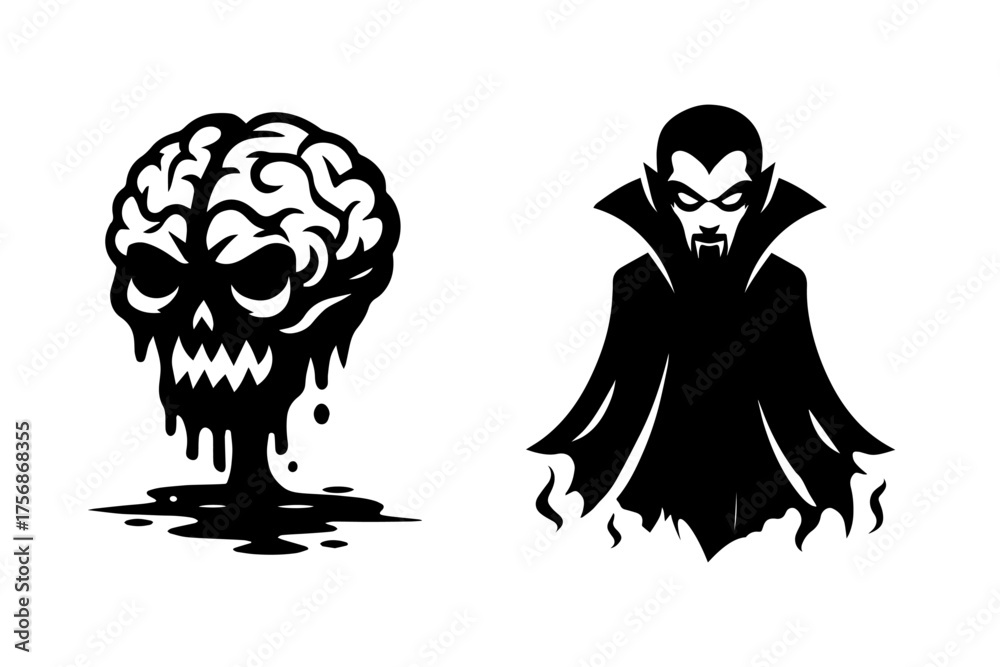 Obraz na plátně Set of two horror-themed Halloween silhouettes: a melting brain skull and a clas