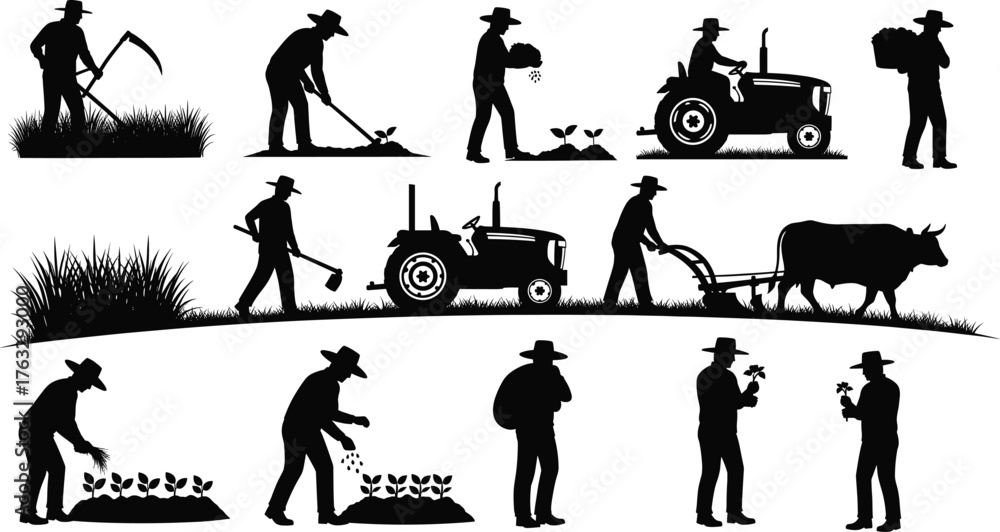 Obraz na plátně Farmers silhouette illustration, agriculture workers with tools, tractor and ox