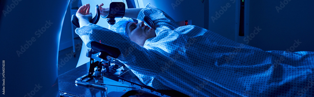 Obraz na plátně Patient undergoing MRI scan in advanced hospital with soothing blue lights