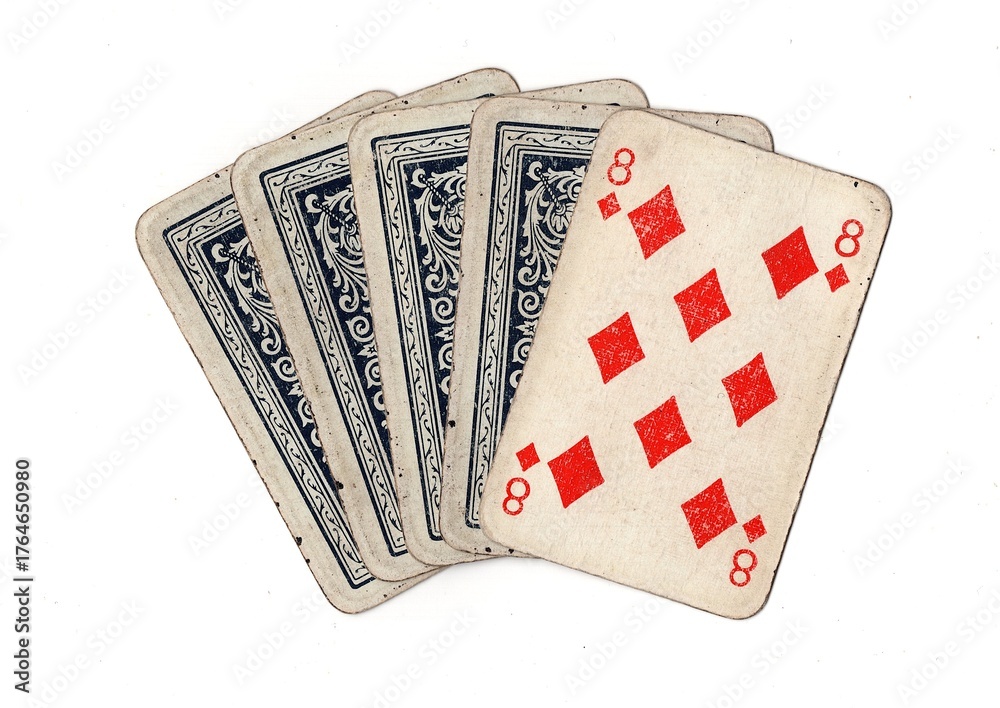Obraz na plátně A hand of grubby old vintage playing cards with one card revealed on a white background