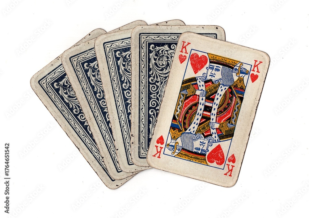 Obraz na plátně A hand of grubby old vintage playing cards with one card revealed on a white background