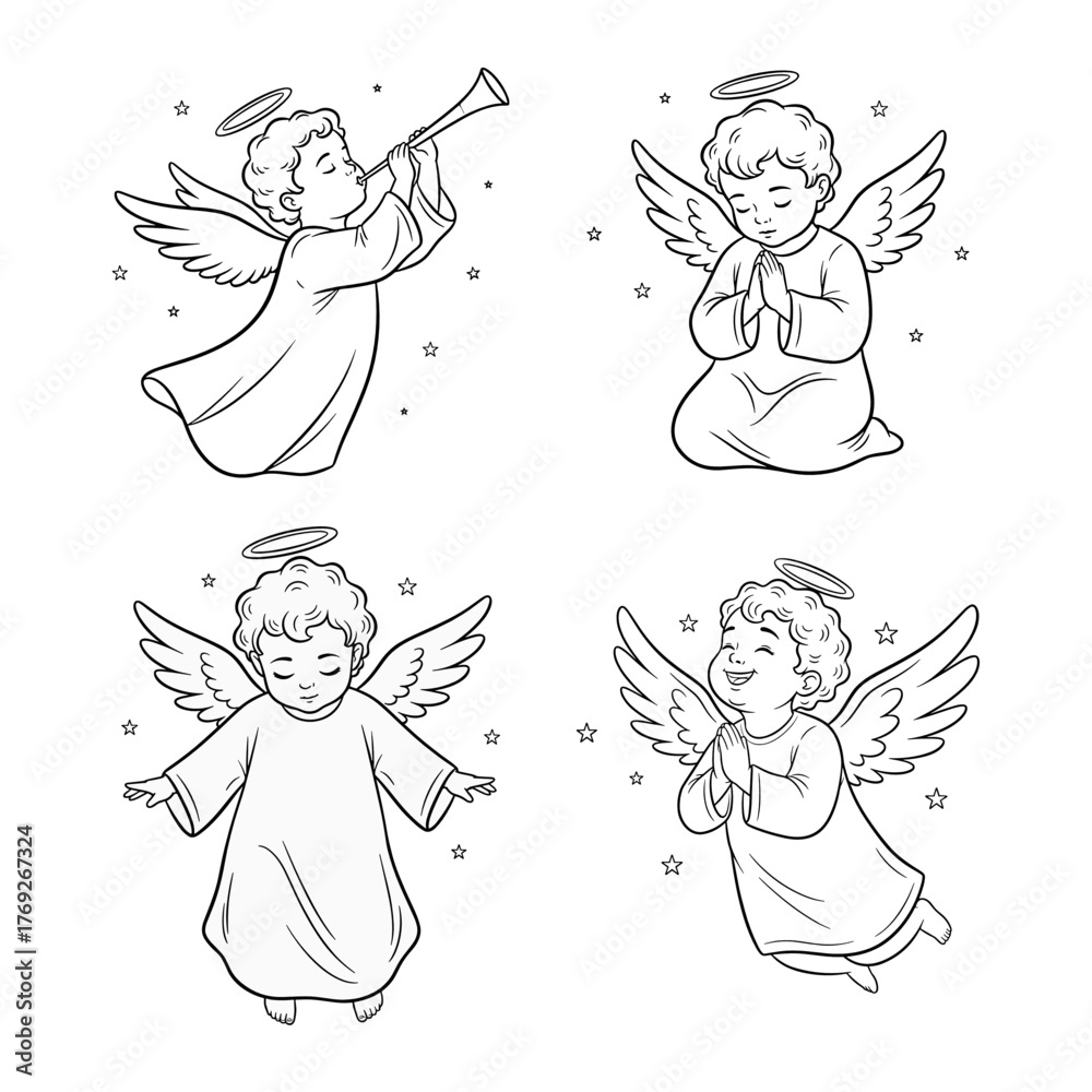 Obraz na plátně Black and white line art cute baby angels illustration set with different poses,