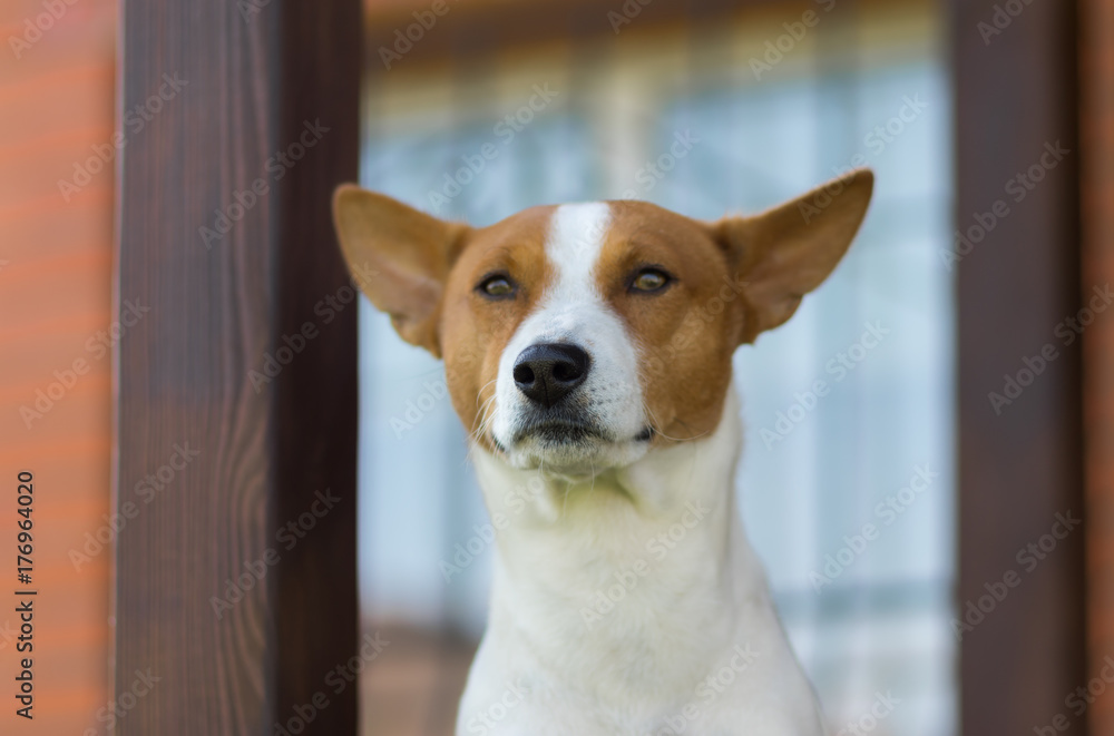 Obraz na plátně Outdoor portrait of royal basenji dog against the house it lives