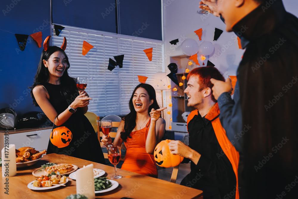 Obraz na plátně Joyful office Halloween party with coworkers in costumes, celebrating with drink