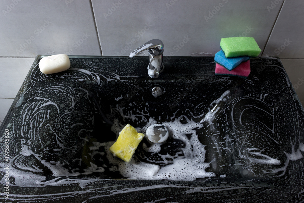 Obraz na plátně Modern black bathroom sink with chrome faucet, colorful sponges and soap