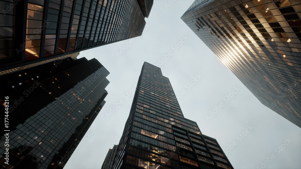 Obraz na plátně Looking up at towering skyscrapers, their glass exteriors reflect the cloudy sky