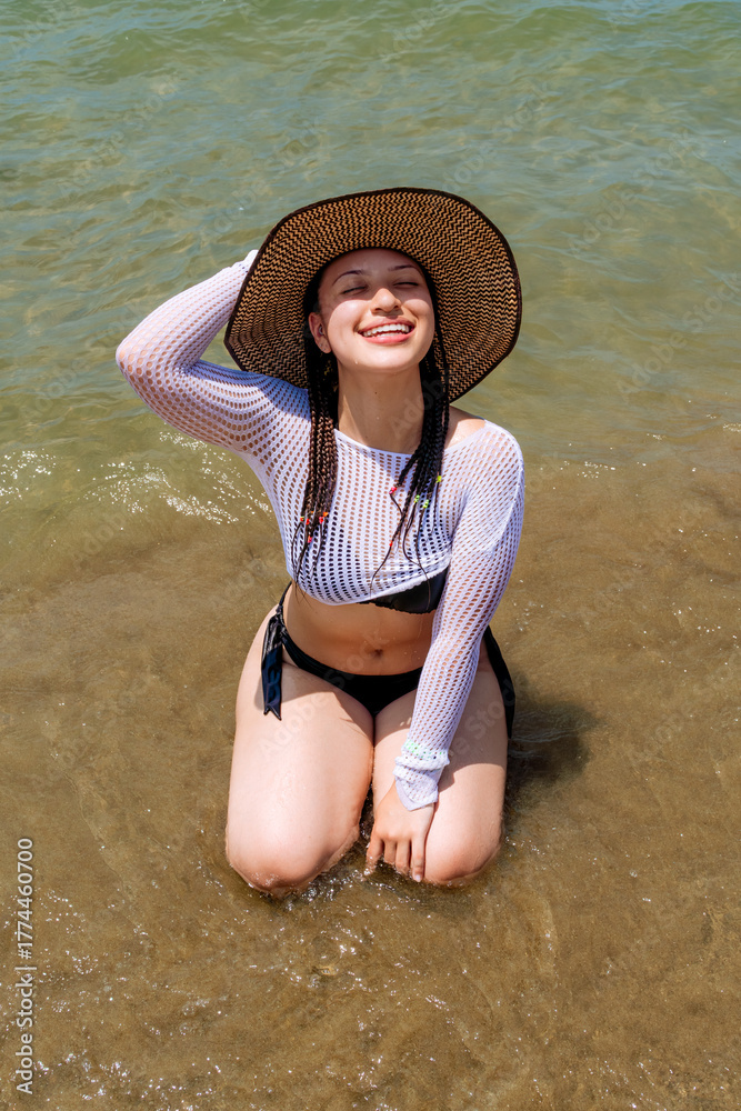 Obraz na plátně Sun-kissed smile in Caribbean shallows — joyful beach moment at Covenhas