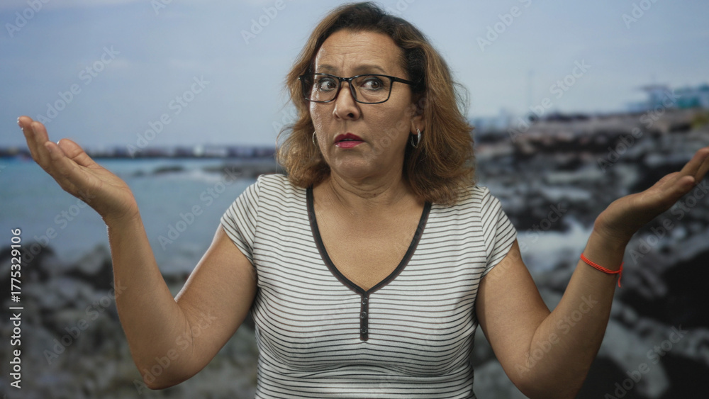 Obraz na plátně Middle aged hispanic woman in striped shirt lifts bare hands shrugging in studio by rocky coast under daylight; uncertainty doubt