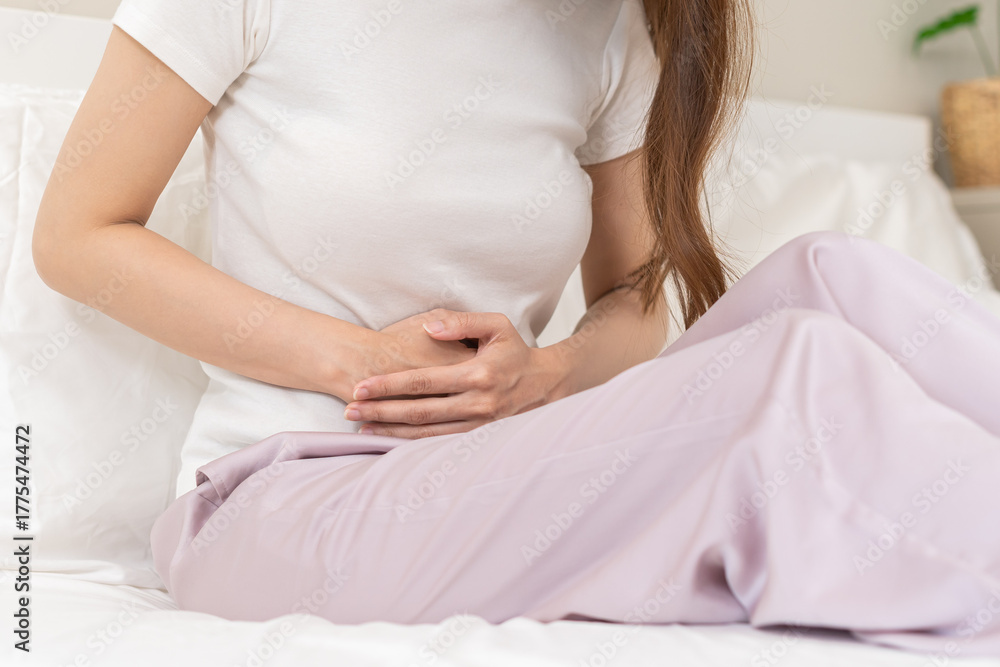 Obraz na plátně Flatulence ulcer, asian young woman, girl hands in belly, stomach pain from food poisoning, abdominal pain and digestive problem, gastritis or diarrhoea