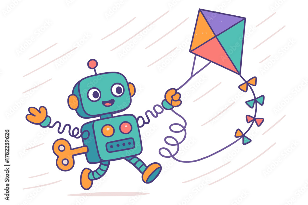 Obraz na plátně Cheerful wind-up toy robot character running quickly while flying a colorful kit