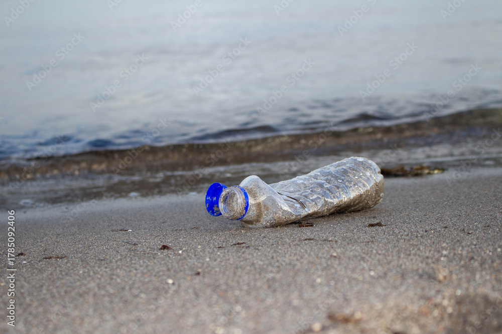 Obraz na plátně Close up of a plastic bootle on the beach, plastic pollution
