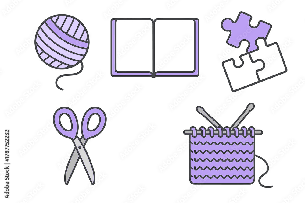 Obraz na plátně Collection of crafting and hobby icons featuring yarn, book, puzzle, and scissor