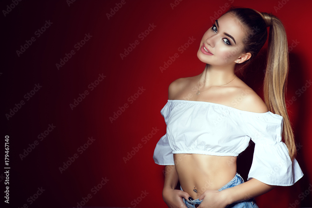 Obraz na plátně Closeup portrait of young beautiful blond lady with perfect make up and long ponytail wearing white short open shoulders top and blue jeans isolated on bright red background