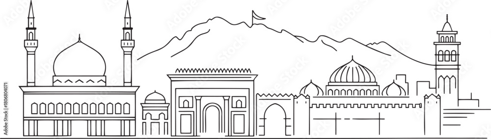 Obraz na plátně Line art panorama skyline showing middle eastern arabic cityscape fortress mosqu