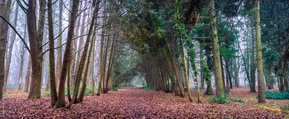 Obraz na plátně Forest path covered with fallen brown leaves winding through a dense tunnel of t