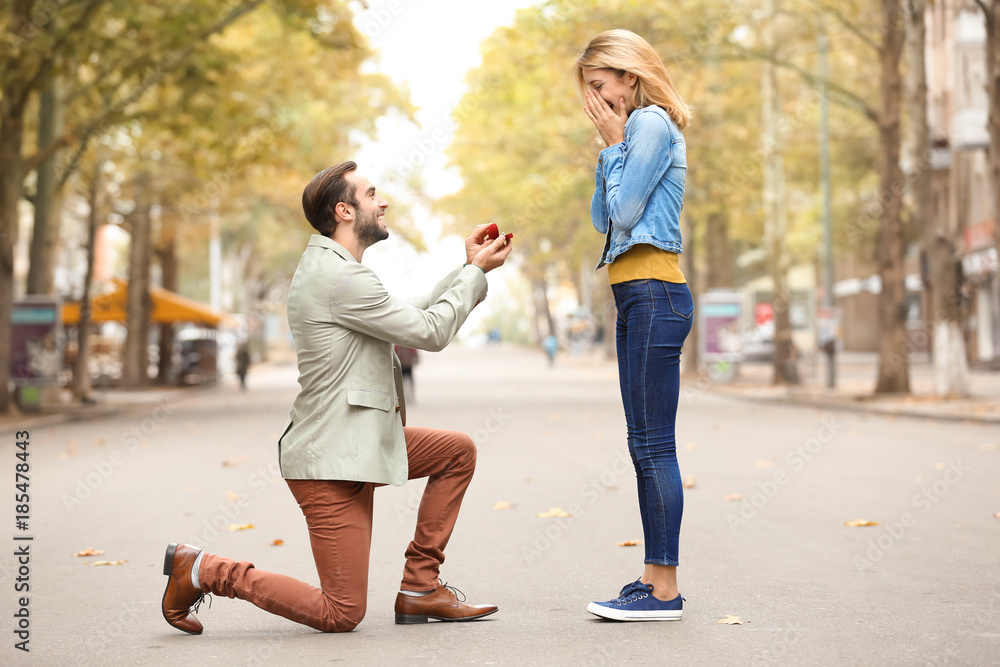 Obraz na plátně Young man with engagement ring making proposal to his beloved girlfriend outdoor