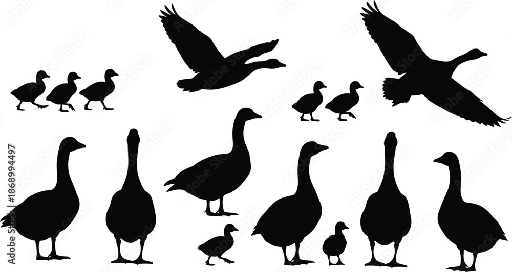 Obraz na plátně Black silhouette of geese and goslings collection, flying goose, farm birds set,