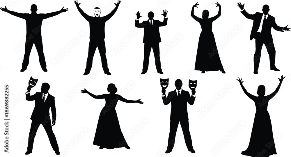Obraz na plátně Collection of theatrical silhouettes featuring actors in expressive poses, formal evening wear, and classical drama masks for performing arts and stage entertainment concepts
