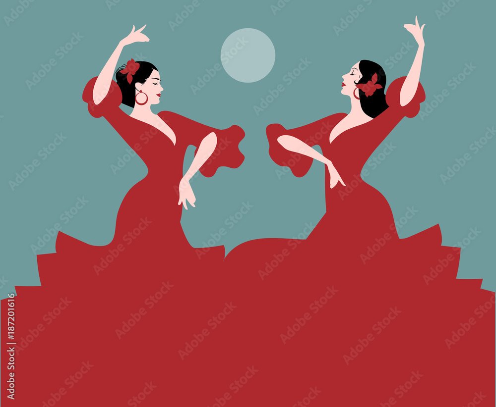 Obraz na plátně Two Spanish flamenco dancers dancing sevillanas, typical Spanish dance