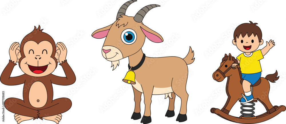 Obraz na plátně Cute cartoon animals and kids illustration set with smiling monkey, farm goat an