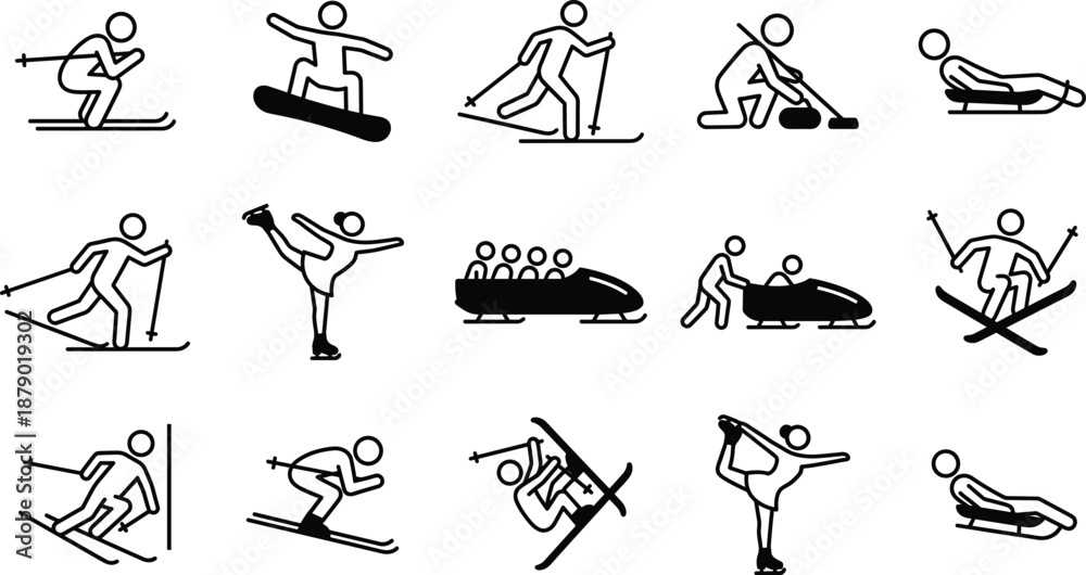 Obraz na plátně Black And White Vector Icon Set Of Winter Sports Silhouettes Featuring Stick Fig