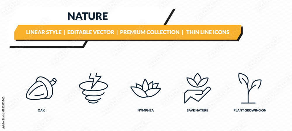 Obraz na plátně nature icons set - oak, , nymphea, save nature, plant growing on book outline vector collection