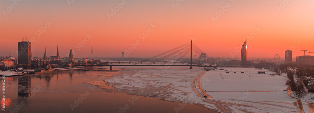 Obraz na plátně Riga, Latvia at winter sunset shows Vansu Bridge, Old Town spires, the Riga Radio and TV Tower, and a Z Towers style high rise by the partly frozen Daugava River