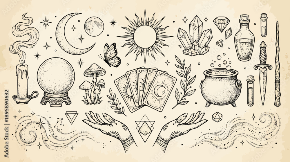 Obraz na plátně Vintage mystical illustration featuring moon, sun, crystals, potions, wand, and