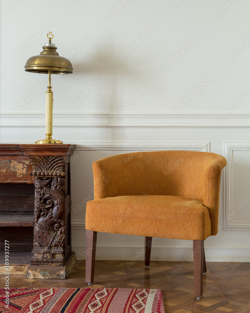 Obraz na plátně Interior shot of orange armchair and wooden vintage ornate sideboard and table l