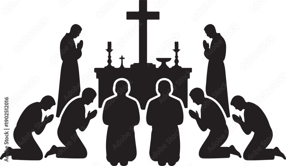 Obraz na plátně Silhouette of worshippers kneeling before altar with cross